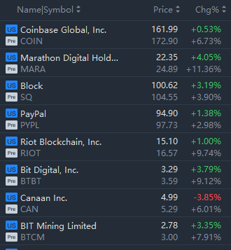 Crypto stocks jumped in premarket trading. Coinbase, Marathon Digital, Bit Digital, Bit Mining, Riot Blockchain, Block and Canaan jumped from 2% to 11%.