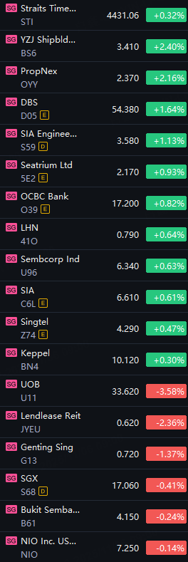 Singapore stocks opened higher on Thursday. STI up 0.3%; YZJ Shipbldg and ProNex up 2%; DBS, SIA Engineering and Seatrium up 1%; UOB down 3%; Lendlease down 2%; Genting Sing down 1%.