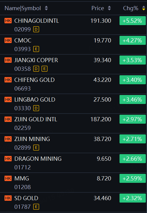 Nonferrous metal shares shined in Hong Kong market. China Gold up over 5%; CMOC up over 4%; Jiangxi Copper, Chifeng Gold, Lingbao Gold up over 3%.
