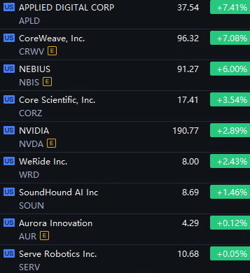 Nvidia Concept Stocks Rally. Applied Digital and CoreWeave Up 7%; Nebius Up 6%; Nvidia and Core Scientific Up 3%; WeRide Up 2%; SoundHound Up 1%.
