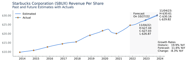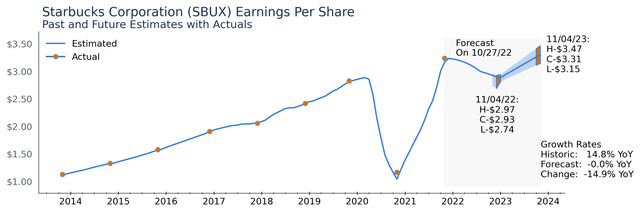 For this earnings call earnings are expected to come in between $2.74 and $2.97 per share with a most likely result of $2.93. More importantly earnings are projected to be essentially flat over the next two years when contrasted to a long-term historic growth rate of 14.8%. This forecast decrease in earnings growth is a result of multiple causes. Semi-successful unionization efforts in 2022, food price inflation from the Russian invasion of Ukraine, and additional coffee bean price inflation from poor growing conditions in South America are all impacting costs.