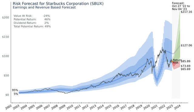 For Starbucks this results in a value at risk of 23% from a price prediction low of $65.69. Potential return is forecasted to be 41.4% based on a central intrinsic value of $127.06. Combined with a 2.2% dividend the total potential return becomes 43.6%. I don't put much value in the upper end of the forecast. It seems unlikely that prices would reach that level in the next year.