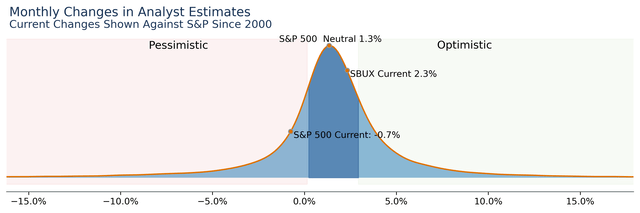 Analyst estimates for earnings and revenue generate the above charts. However, all humans are prone to bias based on their incentive structure. The below chart summarizes analyst behavior for all stocks in the S&P across the last 2 decades. The neutral point shows analysts tend to raise estimates by 1.3% monthly and are currently pessimistic on the S&P having decreased estimates by 0.7%. Starbucks shows somewhat positive sentiment at 2.3% increase over the past month.