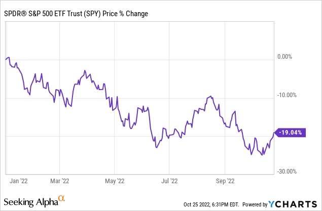 Year-to-date, the SPY has taken a beating, as - despite a strong run over the past few days - the index is still down by nearly a fifth: