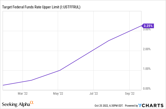 This increase has been driven in part by the Federal Funds rate, which has soared from near zero to 3.25%, with more hikes expected in the coming months and possibly even in 2023: