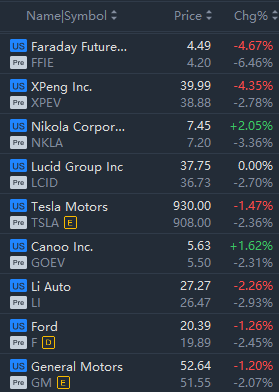 EV stocks dropped in premarket trading, with Faraday Future falling over 6% and XPeng falling over 3%.