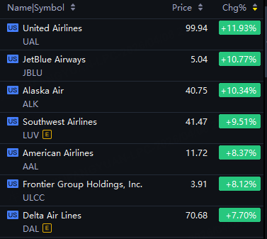 United Airlines up 12%; JetBlue up 11%; Alaska Air, Southwest Airlines up 10%; American Airlines, Frontier, Delta Air up 8%.