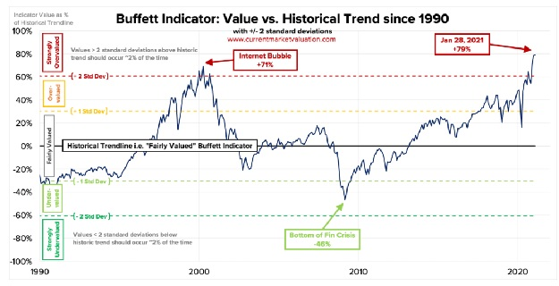 Pretty much any popular stock valuation indicator backs up this assertion, but the most dramatic is probably the “Buffet Indicator,” so named because legendary investor Warren Buffet uses it to decide how to allocate his billions. It’s also easy to understand: chart the aggregate market capitalization of all US stocks against GDP and there you are. When stocks are low versus GDP, they’re underappreciated and undervalued; when high compared to GDP they’re overvalued. Today they’re higher than ever before, including just before the last two major bear markets.