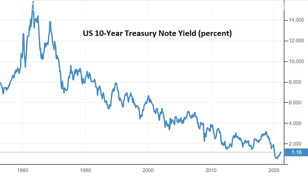 The bond and money markets, made up of instruments that pay interest, are in the aggregate far bigger than the world’s stock markets. And they’ve been booming, with interest rates falling steadily for four straight decades. Since bond prices are the reciprocal of bond yields, the next chart can be read as an epic bull market in bonds, one which has gained steam in the past year as massive currency creation has forced fixed income investors (who have to invest new cash somehow) to buy bonds regardless of what they yield.
