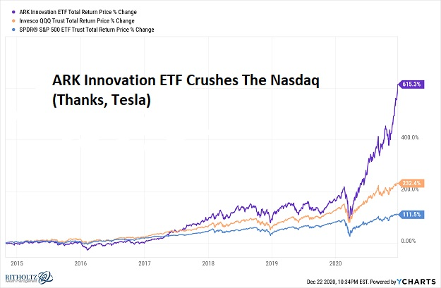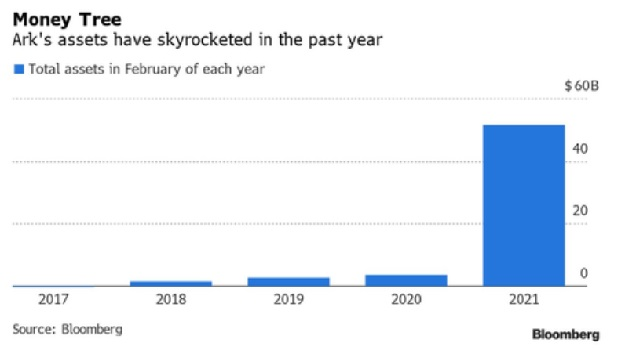 The everything bubble’s supernova is the ARK Innovation ETF, run by hitherto obscure (and now household name)Cathie Wood. Her “innovation”? She loaded up on Tesla stock right before it embarked on an epic (and inexplicable) 1000% run that made it more valuable than the ten biggest carmakers on the planet combined.