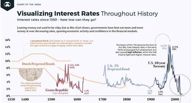 To further illustrate how uniquely dysfunctional the world’s bond markets have become, here’s a chart going back to the 1300s showing that today’s rates aren’t just low by modern standards, but are the lowest in human history. Which is another way of saying today’s bond bubble dwarfs anything anywhere ever.