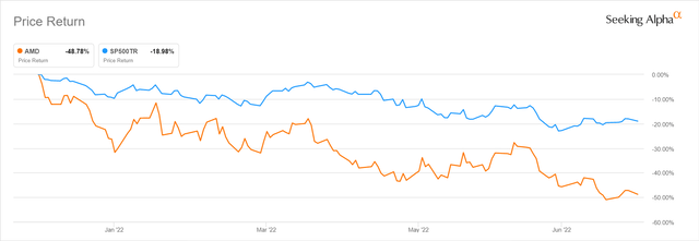 AMD stock dropped by -48.8% this year thus far, which stands in stark contrast to the S&P 500's less severe -19.0% pullback year-to-date.