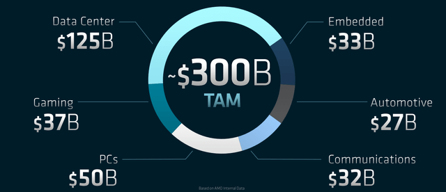It is also noteworthy how much AMD's TAM estimate has grown in the past two years. Previously, AMD had estimated its TAM to be $79 billion at its prior Analyst Day in March 2020. Moving forward, it has forecasted at the recent June 2022 Analyst Day that its TAM will grow by +280% to $300 billion in 2025. AMD's pro forma revenue of $20.1 billion adjusted for the Xilinx acquisition is only about 7% of its $300 billion TAM, suggesting that there is a long growth runway ahead for the company.