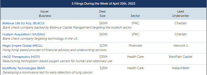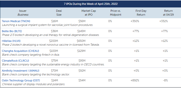 Four IPOs raised $266 million this week, headlined by norovirus vaccine developer HilleVax (HLVX). The other three deals were micro-caps, an area of the IPO market that continues to see rapid price swings thanks to interest from momentum traders. Three SPACs also raised a combined $245 million, targeting Asian fintech, sustainable energy, and technology.