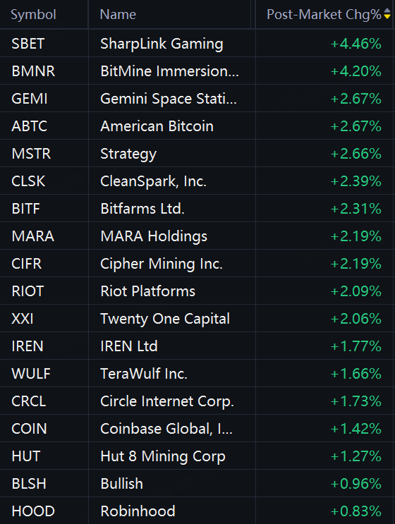 Bitcoin rose to $95,696, while Ethereum gained to $3,333 after the news. Crypto stocks jumped in aftermarket trading. SharpLink Gaming rose 5%; BitMine rose 4%; Strategy rose 3%; CleanSpark, Bitfarms, MARA Holdings, Cipher Mining, IREN, and Circle rose 2%; Coinbase rose 1%.