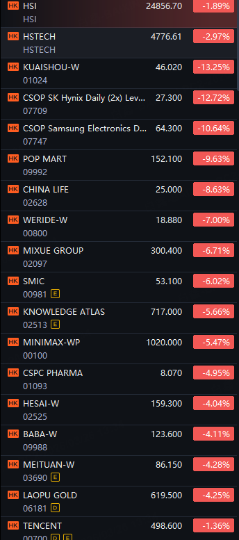 Kuaishou and SK Hynix-Related ETF Down 13%; Samsung-Related ETF Down 11%; Pop Mart Down 10%; China Life Down 9%.