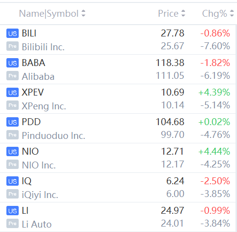 Bilibili fell over 7%; Alibaba fell over 6%; XPeng fell over 5%; NIO fell over 4%.