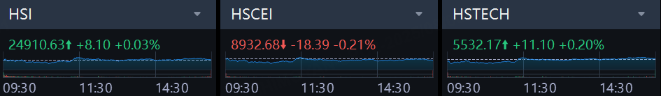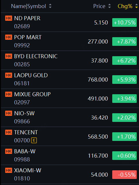 ND Paper surged by 10.75%; Pop Mart up nearly 8%; BYD Electronic up about 7%; Laopu Gold up 6%; Mixue Group up 4%; NIO, Tencent up around 2%; Alibaba up within 1%.