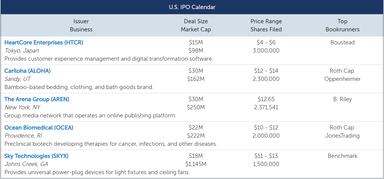 While not listed below, two unit offerings are expected price: AdTech platform Direct Digital Holdings (DRCT) plans to raise $18 million at a $109 million market cap, and early-stage aquaculture company The tru Shrimp Companies(BTRU) plans to raise $15 million at a $140 million market cap.