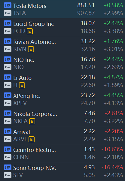 EV stocks climbed in premarket trading. Tesla, Lucid, Rivian, Xpeng Motors, Nikola and Arrival rose about 3%.