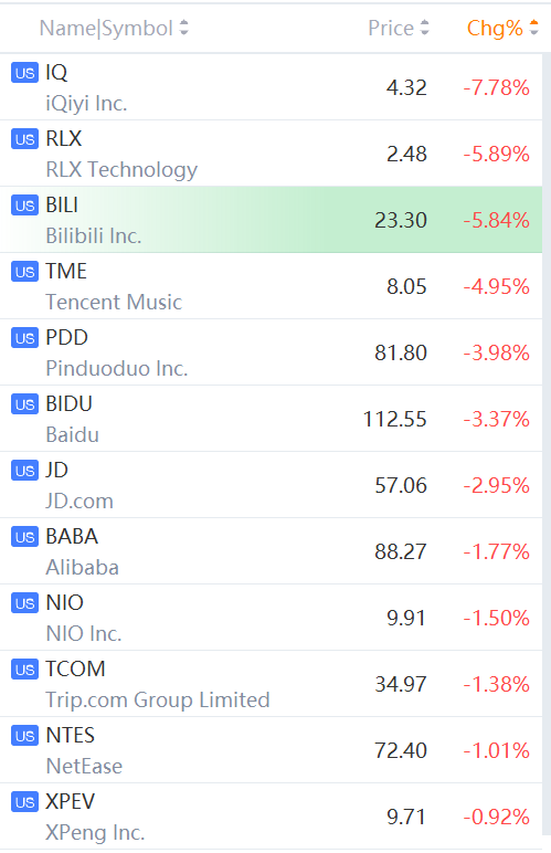 iQiyi fell over 7%; Bilibili, RLX Technology fell over 5%; Pinduoduo fell 4%; Alibaba, JD.com fell about 2%.