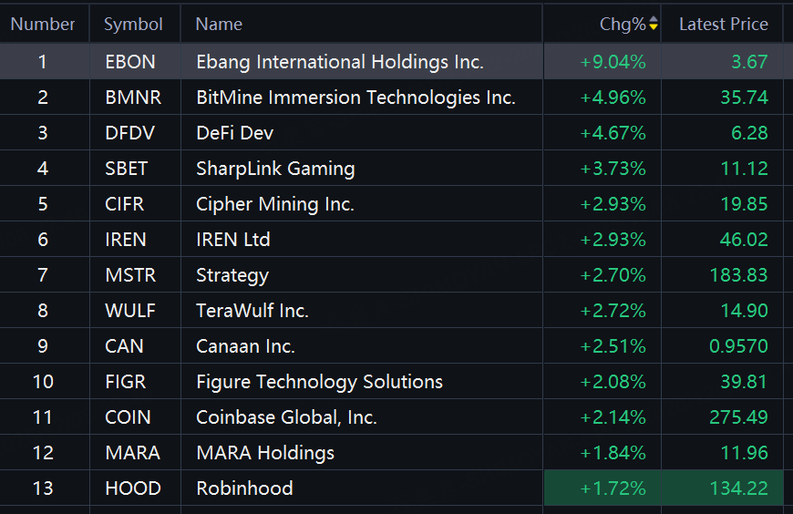 Crypto shares jumped on Monday. BitMine up 5%; DeFi Tech up over 4%; SharpLink Gaming, Cipher Mining, IREN up about 3%.