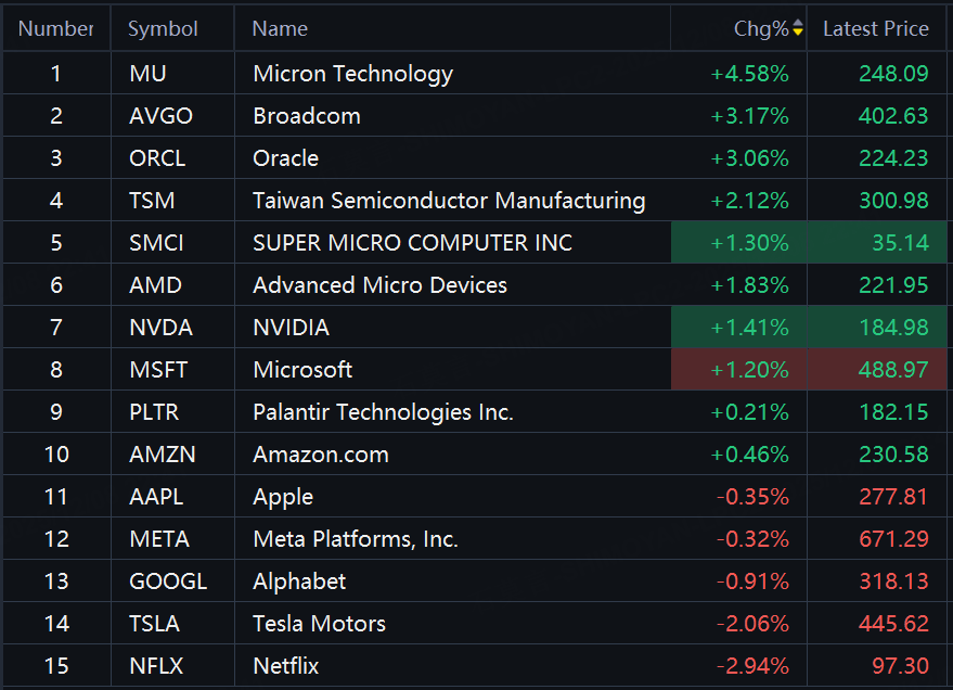 Big tech stocks mixed on Monday. Micron up over 4%; Broadcom, Oracle up over 3%; TSMC up 2%; AMD, Nvidia shares rose over 1%; Tesla stock fell 2%; Netflix fell about 3%.