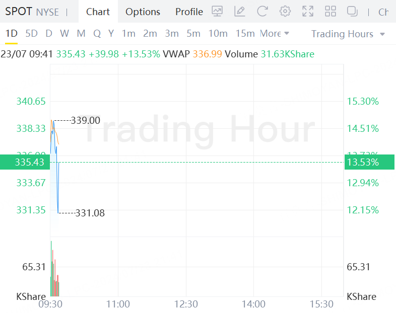 Spotify posted a record quarterly profit slightly ahead of analyst expectations on Tuesday, pushing its shares up more than 13% in morning trading.