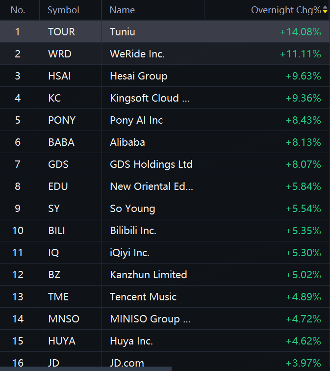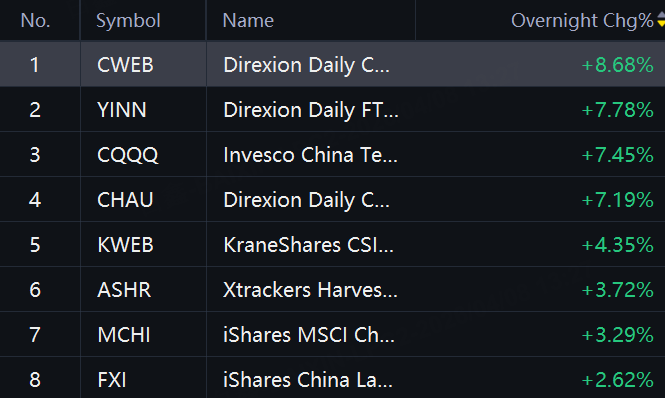 Chinese ADRs and ETFs kept rally in overnight trading. Tuniu up 14%; WeRide up 11%; CWEB, Hesai and Kingsoft Cloud up 9%; YINN, Pony AI, Alibaba and GDS up 8%.