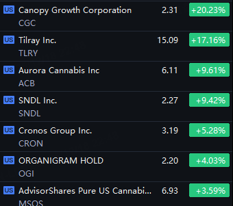 Cannabis Stocks Kept Rally. Canopy Growth Up 20%; Tilray Up 17%; Aurora Cannabis And SNDL Up 9%; Cronos Up 5%; OGI Up 4%.