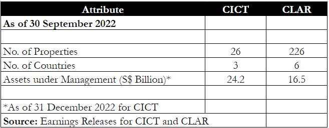 CICT is a retail cum commercial REIT while CLAR is Singapore’s largest industrial REIT.