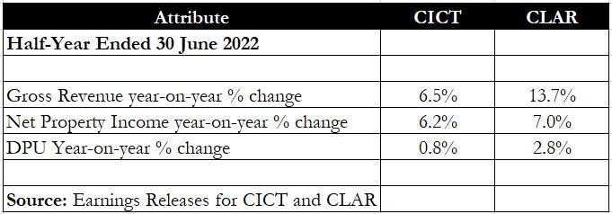Moving on to financials, we used the fiscal 2022’s first half (1H2022) to compare the two REITs as CLAR did not disclose its financial numbers for the third quarter and first nine months of this year.