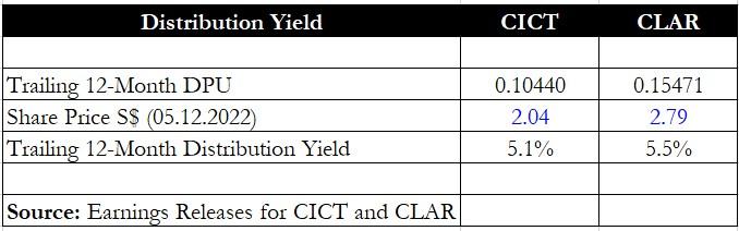 CLAR posted a slightly better year on year increase of 2.8% for its DPU, compared to CICT, where DPU inched up just 0.8% year on year.