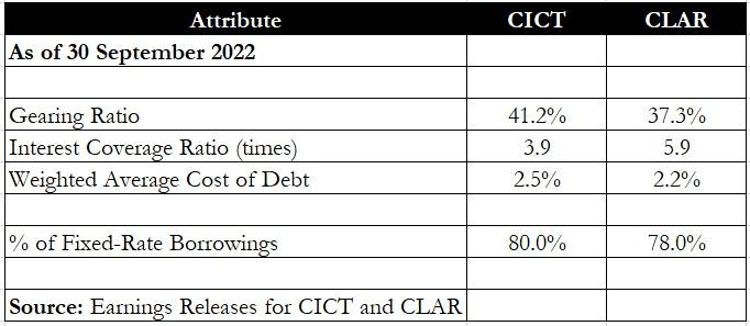 But when it comes to fixed-rate borrowings, CICT has a slightly larger proportion (80%) compared with CLAR’s 78%.
