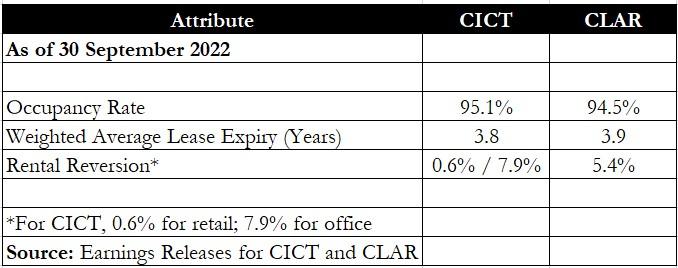 If we average the two divisions’ rental reversion for CICT, we get around 4.2%, which is still lower than CLAR’s 5.4% reversion rate.