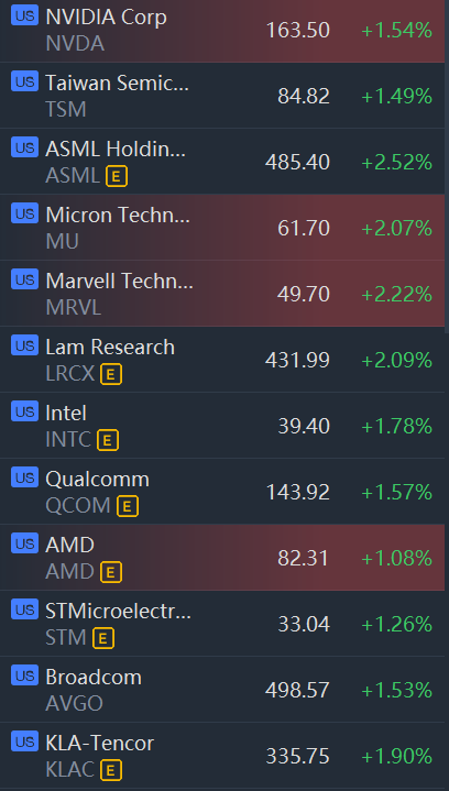 Semiconductor stocks climbed in morning trading. Nvidia, TSMC, AMD, ASML, Micron, Intel, Lam Research, Marvell, Qualcomm and Broadcom climbed between 1% and 3%.