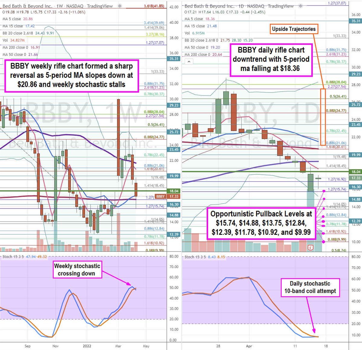 Using the rifle charts on the weekly and daily time frames provides a precision view of the landscape for BBBY stock. The weekly rifle chart bottomed out on earnings at the $15.74Fibonacci (fib) level. The weekly rifle chart uptrend stalled as shares dropped sharply on the earnings. The weekly 50-period moving average (MA) resistance sits at $21.66. The weekly 5-period MA is sloping down at $20.86 as 15-period MA flattens at $17.42. The weekly 200-period MA sits at $16.91. The weekly stochastic peaked and is crossing back down at the 50-band. The weekly market structure low (MSL)buy triggers on a breakout above $18.04. The daily rifle chart has a downtrend with a falling 5-period MA at $18.36 and 50-period MA at $19.20. The daily 200-period MA resistance is at $20.64 and 15-period MA is falling at $21.48. The daily lower Bollinger Bands (BBs) sit at $15.20. The daily stochastic is smothered under the 10-band as it attempts to cross back up.Prudent investors can watch for opportunistic pullback levels at the $15.74 fib, $$14.88, $13.75 fib, $12.84 fib, $12.39, $11.78 fib, $10.92 fib, and the $9.99 fib level. Upside trajectories range from the $21.06 fib level to the $27.54 fib level.