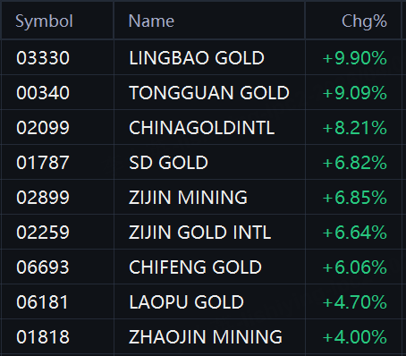 Gold stocks rallied in Hong Kong. Lingbao Gold rose 10%; Tongguan Gold rose 9%; China Gold International Resources rose 8%; SD Gold, Zijin Mining, and Zijin Gold International rose 7%; Chifeng Gold rose 6%; Laopu Gold rose 5%; Zhaojin Mining rose 4%.
