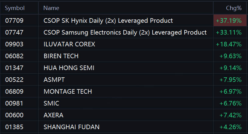 Chip stocks jumped in Hong Kong. CSOP SK Hynix Daily (2x) Leveraged Product rose 37%; CSOP Samsung Electronics Daily (2x) Leveraged Product rose 33%; Iluvatar CoreX rose 19%; Biren Tech rose 10%; Hua Hong Semi rose 9%; ASMPT rose 8%; AXERA, Montage Tech, and SMIC rose 7%; Shanghai Fudan rose 4%.