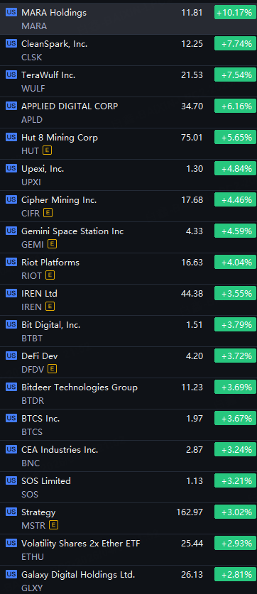 Crypto Shares Rally. MARA up 10%; CleanSpark and TeraWulf up 7%; APLD up 6%; Riot up 4%; Strategy up 3%.