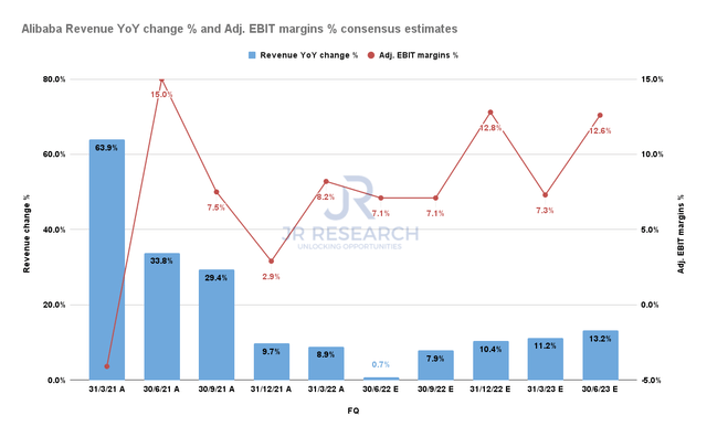 Alibaba revenue change % and adjusted EBIT margins % consensus estimates(S&P Cap IQ)