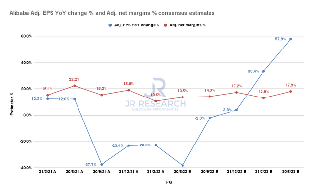 Notably, the consensus estimates suggest that the Street is confident that Alibaba's beaten down profitability could recover remarkably through FY23, despite slowing topline growth, as seen above. Its adjusted net margins are also expected to bottom out in FQ4'22 before improving significantly through FY23-24.