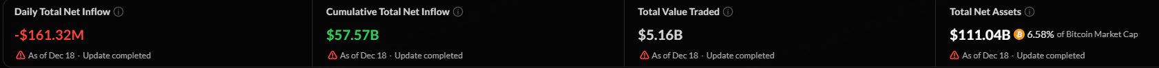 The overall net outflow of the US Bitcoin spot ETF on Thursday was $161.32 million. The total net asset value of Bitcoin spot ETFs is $111.04 billion, and the ETF net asset ratio (market value compared to total Bitcoin market value) is 6.58%.
