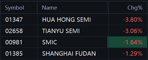 Semiconductor stocks dropped in Hong Kong. Hua Hong Semiconductor fell 4%; Tianyu Semiconductor fell 3%; SMIC fell 2%; Shanghai Fudan fell 1%.