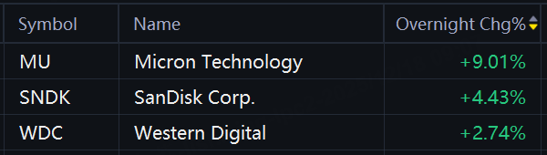 Other Memory-chip peers also gained in overnight trading. SanDisk rose 4.4%; Western Digital rose 2.7%.