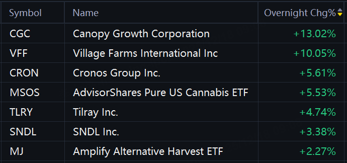 U.S. President Donald Trump is expected to sign an executive order on Thursday reclassifying marijuana to ease federal restrictions, according to CNN, which cited a source familiar with the planning and a senior White House official. Cannabis stocks and ETFs jumped in overnight trading. Canopy Growth rose 13%; Village Farms rose 10%; Cronos and AdvisorShares Pure US Cannabis ETF rose 6%; Tilray rose 5%; SNDL rose 3%; Amplify Alternative Harvest ETF rose 2%.