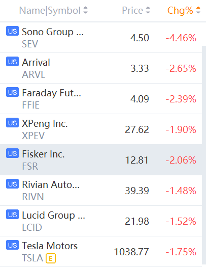 Sono Group, Arrival, Rivian, Tesla, Faraday Future, Xpeng and Lucid slid between 1% and 5%.