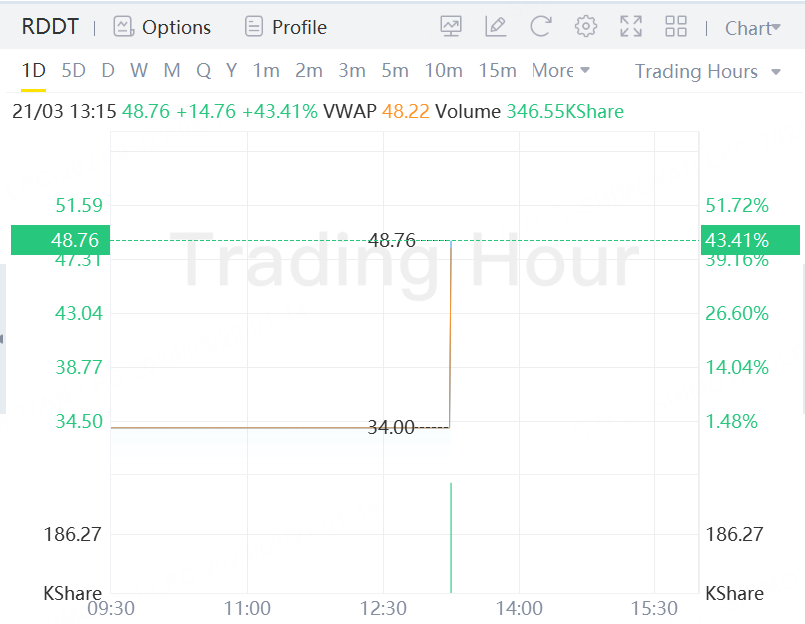 Reddit shares surged 43.41% to $48.76 per share on strong Nasdaq debut. The popular news aggregation social media site priced its initial public offering at $34 a share, at the high end of its expected range of between $31 and $34 a share.