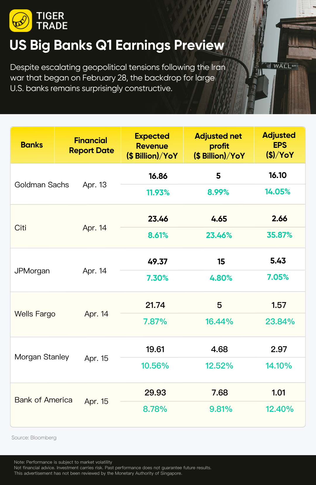 Goldman Sachs will kick off earnings season for banks on Monday. The largest U.S. lender, JPMorgan Chase JPM.N, will report on Tuesday along with Wells Fargo and Citigroup C.N. Bank of America BAC.N and Morgan Stanley will report on Wednesday, April 15.