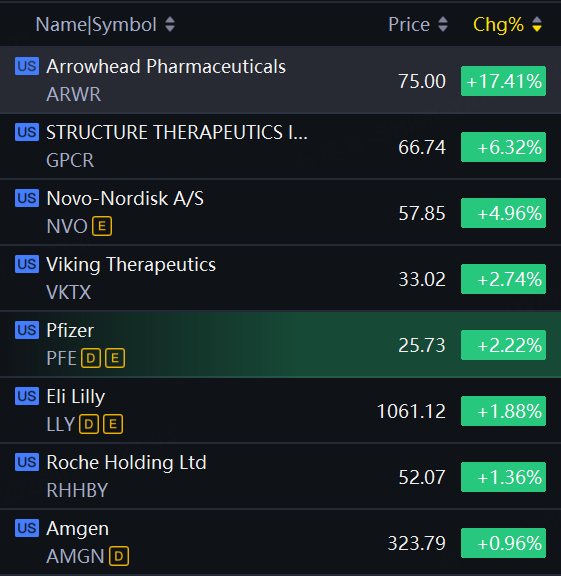 Weight-loss drugmakers' stocks jumped. Arrowhead up over 17%; Structure Therapeutics up over 6%; Novo Nordisk up 5%; Viking, Pfizer, Eli Lilly up around 2%.
